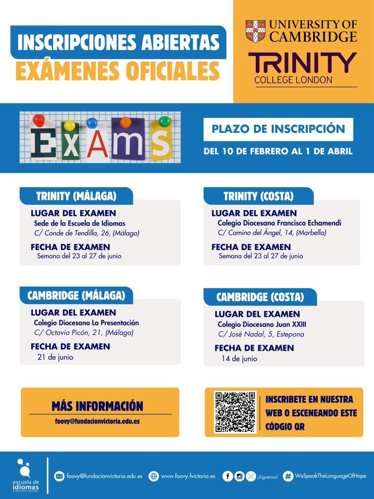 La Escuela de Idiomas de Fundación Victoria abre el plazo de inscripción para las convocatorias de exámenes oficiales de Cambridge y Trinity College London, ofreciendo a los alumnos la oportunidad de certificar su nivel de inglés en distintas sedes de Málaga y la Costa del Sol.